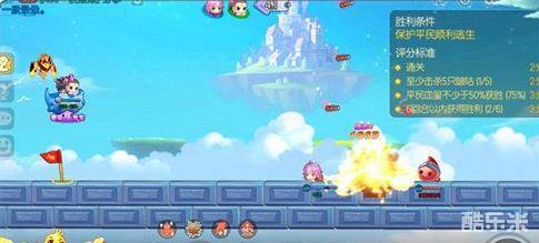 开局第一回合,啵咕小怪的站位都相对分散,不便于集中开火攻击,因此应逐个击破,先击杀其中一只。第二回合,小怪的站位相对紧凑,同时不断向平民身旁靠拢,继续击杀剩余的一只啵咕。第三回合,使用爱心回力标必杀技,配合增幅弹与速射道具,注意炮弹的落点,以便在进攻啵咕的同时还能为平民回血。后续回合继续循环之前操作,直至将平民两侧的啵咕清理干净。最后,再使用增幅弹等道具将啵咕追捕者击杀即可顺利通关,获得S级通关评价。