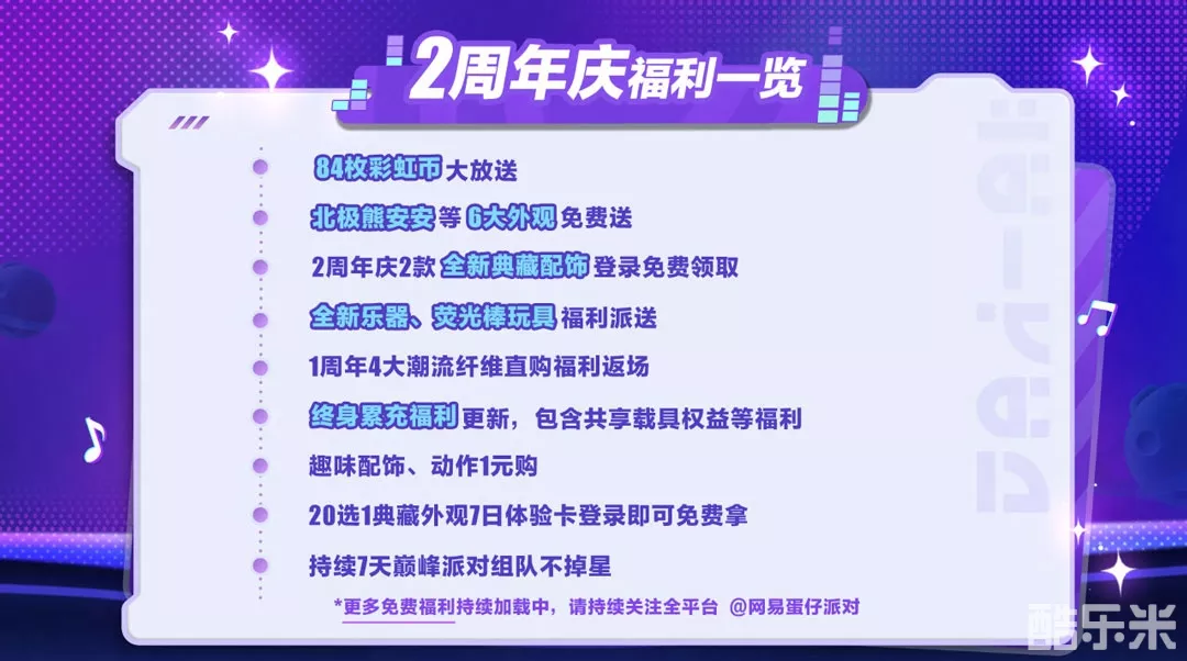 两载相伴,因你精彩。在2周年庆中,海量福利将携同众多精彩活动一同登场,回馈蛋仔们长久以来的喜爱与支持。84枚彩虹币,北极熊安安等6大外观,2款二周年庆典藏配饰,全新乐器与荧光棒玩具,20选1典藏外观7日体验卡,统统免费放送!更有4款一周年潮流纤维直购返场,终身累充福利更新,趣味配饰动作1元购等惊喜为你而来!更多免费福利持续加载中,敬请持续关注!