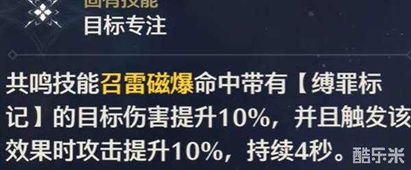 固有天赋:目标专注,还可以给10%的伤害加成。同时吟霖堆暴击面板会比较轻松,天赋给的固定爆率为8%