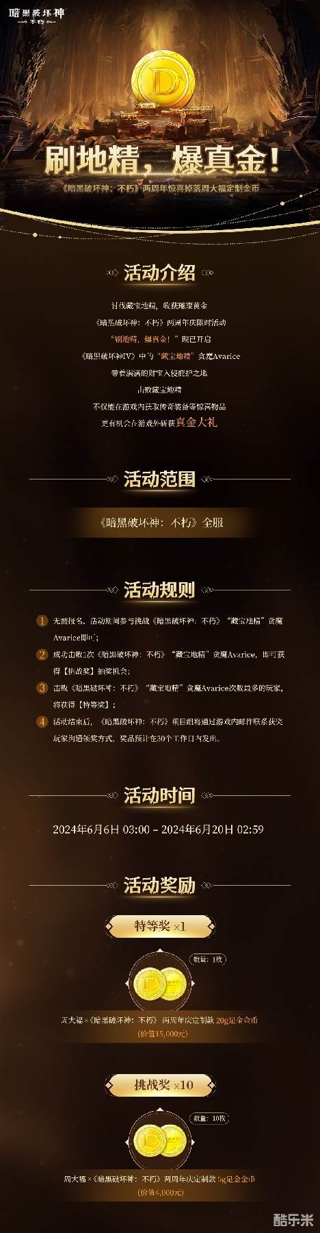 真金相伴,情怀无限!宝箱中的财宝闪耀金色的光辉,璀璨的金币吸引着每一位冒险者的眼眸。值此两周年庆典之际,《暗黑破坏神:不朽》特意携手业界知名品牌周大福,打造两周年庆定制款金币,以真金铸真情,用真金换真心!“刷地精,爆真金!”活动期间,击败“藏宝地精”次数最多的玩家,将收获一枚两周年庆定制款20g足金金币,价值15000元。同时,玩家只要成功击败过“藏宝地精”贪魔Avarice至少一次,亦可获得一次抽取价值4000元的两周年庆定制款5g足金金币的机会。活动结束后,《暗黑破坏神:不朽》会通过游戏内邮件联系获奖玩家沟通领奖方式,奖品预计将在30个工作日内发放到玩家们的手中。周年送金,机会难得,还不赶快做好准备,收下属于你的金币大礼。