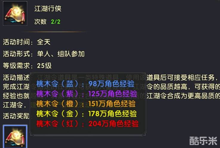 每次参与江湖行侠,会消耗一类特殊的道具——“江湖令”,试用之后将会接取任务,开启江湖行侠。完成江湖令指定的任务后就可获得大量的经验。经验的多少取决于江湖令品质的等级。蓝、紫、橙、金、红等级依次提升,经验奖励逐级递增。