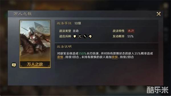【万人之敌】主动战法,对敌军全体造成兵刃伤害并施加“畏惧”状态。若目标拥有“畏惧”效果会概率施加“震慑”状态。