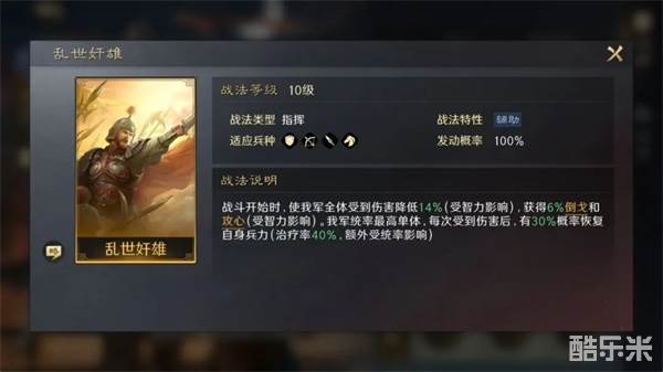【乱世奸雄】:指挥战法,给全队减伤获得“倒戈”和“攻心”效果,统率最高单体受到伤害有概率恢复自身兵力。