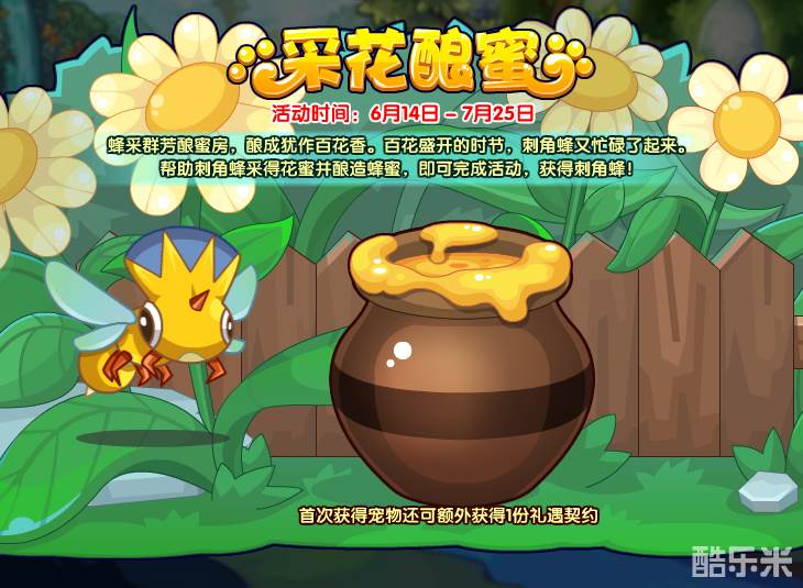 刺角蜂每天都会出现在真梦之园进行采蜜,小洛克们携带好6只主属性为虫系的宠物就找它进行助力吧。单次采蜜需要120秒,完成后可以获得7~10滴蜂蜜。