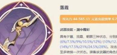 这把武器在四星武器中有相对较高的基础攻击力,而且拥有元素能量充能效率的附加属性,它的被动效果可以增加伤害,但需要一定的启动时间。落霞是一种综合性较强的武器,但它没有出众的优点,所以整体表现较为平庸。该武器最适合的角色是九条。