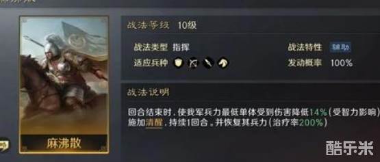 【麻沸散】:回合结束时,使我军兵力最低单体受到伤害降低14%(受智力影响),对其施加清醒,持续1回合。并恢复其兵力(治疗率200%。