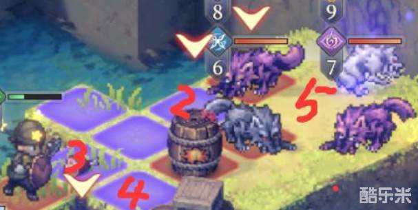 8、1号位置闪击,2号位置普攻,3号位置闪击,然后到没死的狼后面普攻,蝎子旁边,复制这个刺客,普攻蝎子