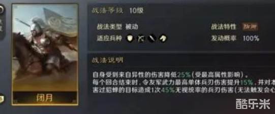 【闭月】:自身受到来自异性的伤害降低25%(受最高属性影响)每个回合结束时,令友军武力最高单体兵刃伤害提升15%,并对本回合内伤害过貂蝉的目标造成1次45%无视统率的兵刃伤害(无法触发会心)。