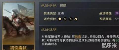 【鸩饮毒弑】:对敌军随机两人施加1层鸩毒状态,持续2回合,并使两名队友获得2回合弑:对持有鸠毒状态的目标造成兵刃或谍略伤害后,有50%概率增加目标1层鸩毒状态。