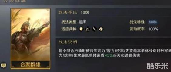 【合聚群雄】:每个回合行动时使我军武力/智力/统率1先攻最高单体分别对敌军武力/智力/统率/先攻最低单体造成45%兵刃和课略伤害。