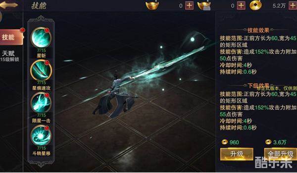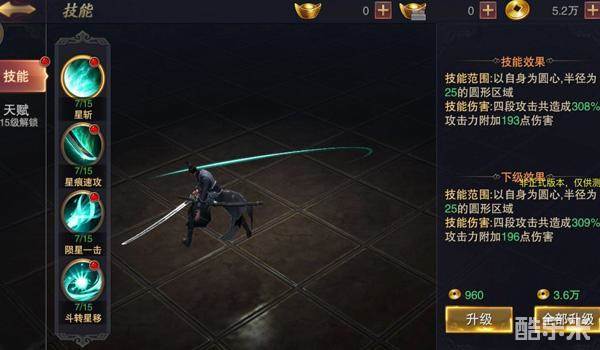主动技能2为陨星一击,以角色自身为圆心,对前方扇形区域造成范围性伤害,冷却时间一般,一共造成二段伤害,伤害和扇形区域的角度随着技能等级的增加而提升