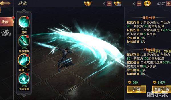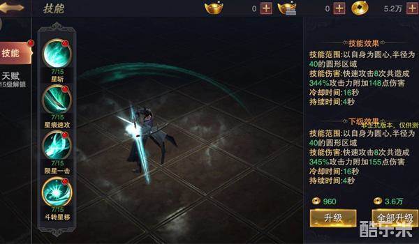 主动技能3为斗转星移,以角色自身为圆心,对圆形区域造成范围性伤害,且为多段式快速攻击,前期就可以造成一共8次伤害,合理地运用斗转星移更有出奇制胜的效果。