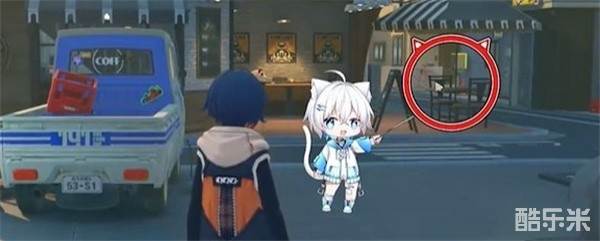 2、接着传送到达咖啡馆,咖啡馆门口左侧货车后找到第二辆小卡格车。