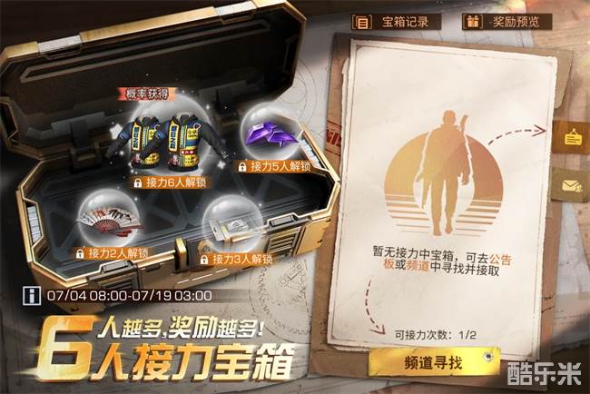 7月4日08:00至7月19日03:00之间大批宝箱将散落废土之上,接力宝箱活动开启。完成宝箱任务后,传递给下一位伙伴,即可一同解锁宝箱获取奖励。接力人越多,奖励越多,若六名幸存者齐心协力,成功解锁宝箱,就有机会获得“最好的我们时装礼盒”。完成活动更可100%将精美时装收入囊中,加入这场寻宝之旅,成为宝箱接力的“淘金者”吧!