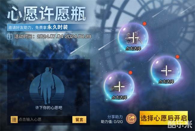 幸运心愿许愿瓶陪你度过整个暑期,“动感玩偶”、“优雅派对”等10款免费永久时装、14件废土奢侈“大牌”家具、“蓝白猫咪”、“螃蟹泡泡机”等10个精美挂饰任你挑选,点亮你的废土之旅!7月4日08:00至8月28日23:59:59之间幸存者可分别在时装许愿池、庄园许愿池、挂饰许愿池中各许下一个愿望,每累积开启十次心愿之门,必有一份心愿达成!在完成任务获得许愿星的同时,还可邀请好友助力更快达成心愿~也别忘了帮助在废土上并肩生存的伙伴们,共度盛夏!