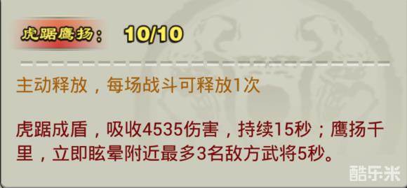 技能名为“虎踞鹰扬”, 虎踞成盾、鹰扬千里,名字挺霸气的,但实话说,真的是不堪一用,可谓两面不讨好的鸡肋。