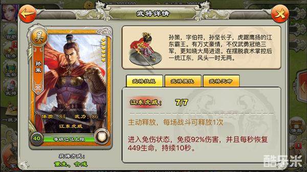孙策,满级时技能:江东虎威。进入免伤状态,免疫92%伤害,并且每秒恢复449生命,持续10秒。
