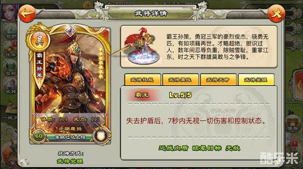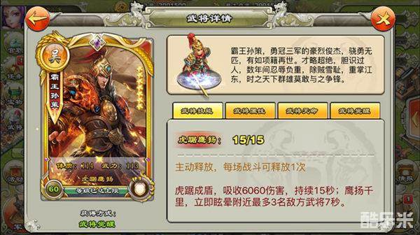 霸王孙策觉醒满级主技能:虎踞成盾,吸收6060伤害,持续15秒;鹰扬千里,立即眩晕附近最多3名敌方武将7秒。