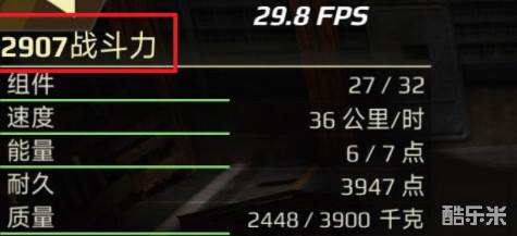 事实上,在实际游戏中,对战的匹配很大程度上取决于战斗力,在对局中会尽可能确保匹配到的是战斗力相近的战车。如下图所示,在组装战车时会将所使用的所有部件的战斗力累加,并显示在装配界面左上角的属性面板上。而既然战斗力如此重要,那么在给战车选择结构部件的时候,除了其自重以外,战斗力也成了一个很重要的衡量标准。