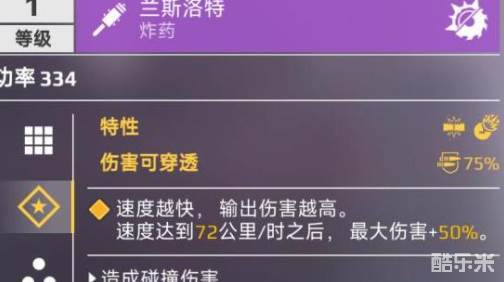 以下图所示的爆破长矛“兰斯洛特”为例,它能在高速行驶状态下造成更多伤害。即便不刻意追求最大加成所需的72km/h(这通常需要推进器,但矛车可能更需要隐身模块),在一般行驶速度下也能获得大约30%至40%的伤害加成。