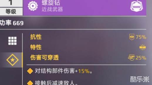 在《创世战车》移动版中,几乎每一款近战武器都有其独特的效果。如下图所示的近战武器“螺旋钻”,它不仅能对结构部件造成额外的伤害,而且在接触敌方战车时,还能产生减速效果。