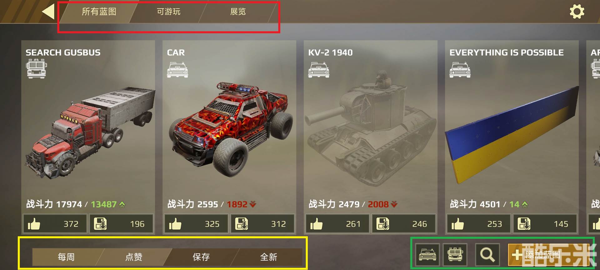 战车博物馆的界面如下图所示,分为4个区域:正中间是选择所要查看蓝图的主界面;左上角红色方框标识的页签会根据战车是否可以加入战斗来进行分类;左下方黄色方框内的按钮则能够根据蓝图的多种条件进行筛选;右下方的绿色方框内的按钮可以进行蓝图的搜索、上传,以及按照类型进行筛选。