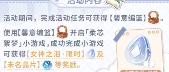 活动期间,完成活动任务可获得【馨意编篮】。使用【馨意编篮】开启「柔芯絮梦」小游戏,成功完成小游戏可获得【女神之泪·限时】及【未名晶片】等奖励