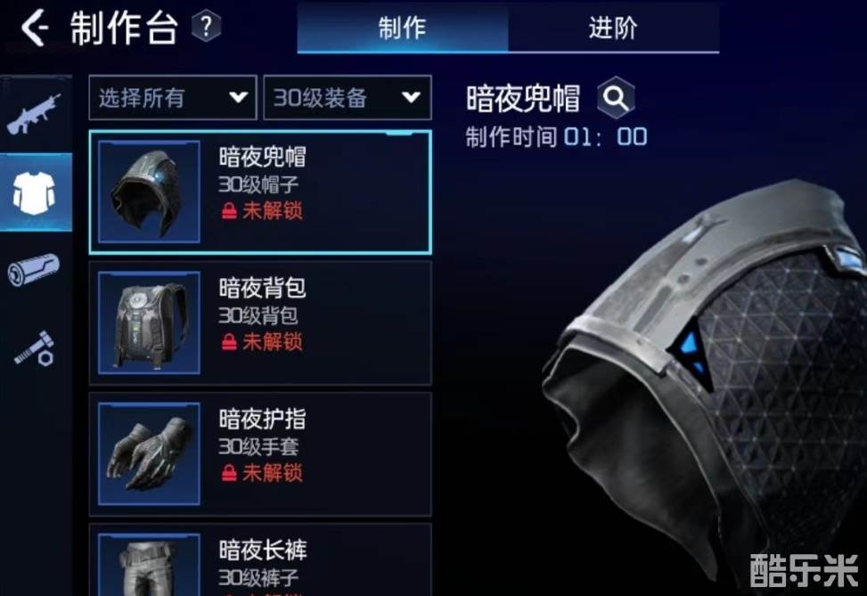 玩家等级达到30级之后即可制作这套套装,这套套装可以伴随玩家装备到40级。玩家想要制作的话要先搜集所需要的材料,首先暗夜套装一共分为六个部件,玩家在进行暗夜兜帽的制作需要用到的材料有16个电子元件,4块塑料,2份纤维布,13个精密零件和5个几丁质外壳,这款帽子可以为角色提供护盾和生命值加成。