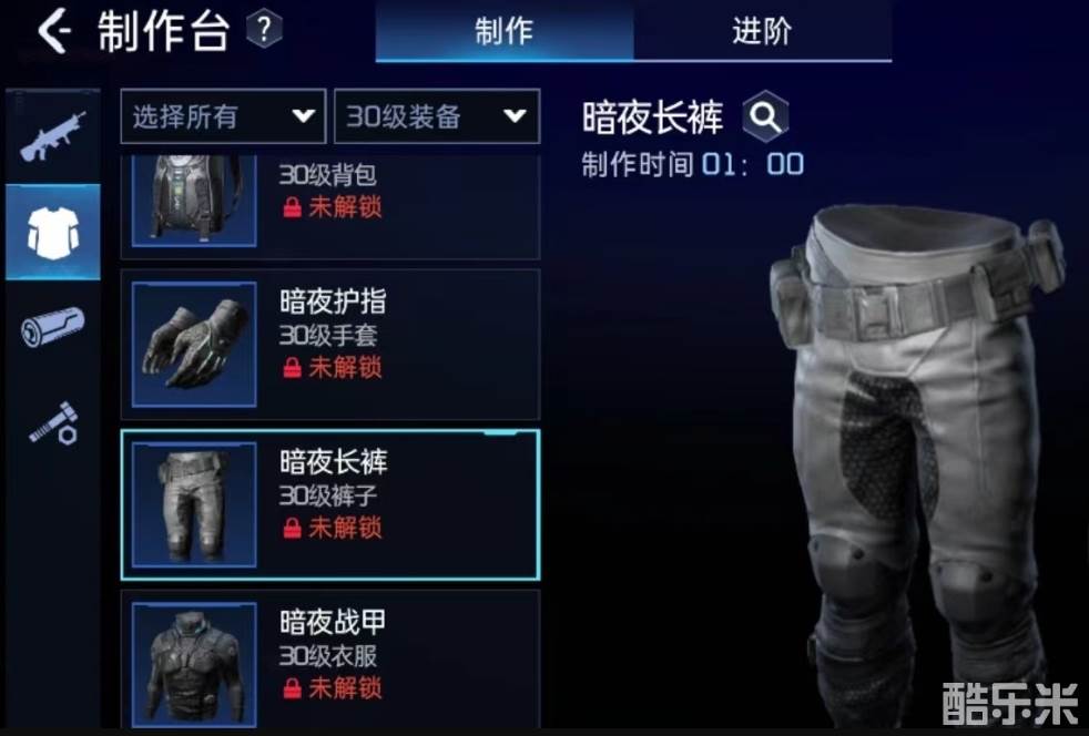 接下来是暗夜手套的制作需要的材料有16个电子元件,4块塑料,3份纤维布,5个几丁质外壳和13个二极管,它可以提高攻击的暴击率以及伤害值加成。暗夜长裤的制作材料有16个电子元件,5个几丁质外壳,4块塑料,13个精密零件和2份纤维布,暗夜长裤可以提供防御属性,并且采用仿生纤维制作,亮面有色泽。暗夜战甲的制作材料有16个电子元件,2份纤维布,13个精密零件,5个几丁质外壳和3块陶瓷。