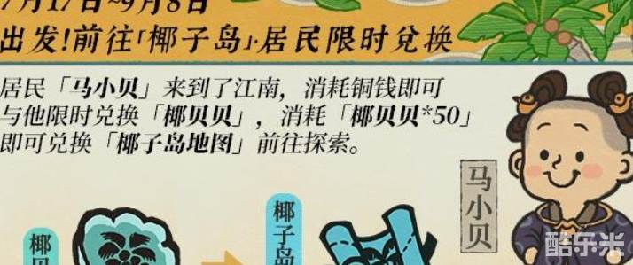 <壹> 前往游戏内寻找居民「马小贝」,使用 铜钱每日与他兑换「椰贝贝」,消耗「椰贝贝*50」即可免费兑换「椰子岛地图」。*知府等级37级以上且 解锁松江府可前往「椰子岛」。