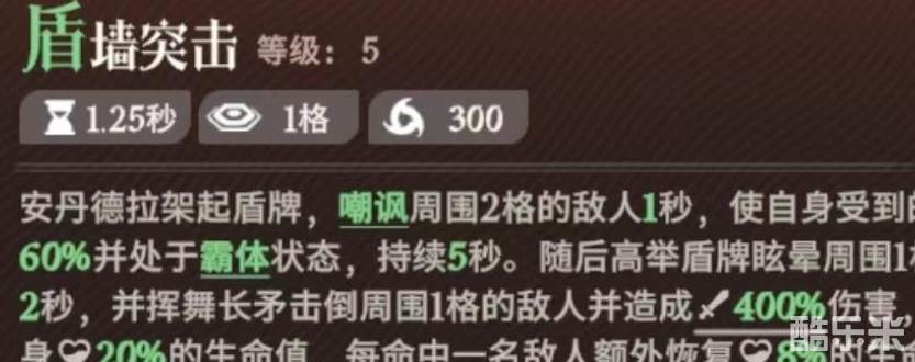 流放之矛安丹德拉是一名来自蛮血部落的坦克型角色。必杀技盾墙突击架,起盾牌后嘲讽周围敌人,降低自身受到的伤害,并处于霸体状态,持续5秒钟。随后利用盾牌将周围敌人眩晕,并挥舞长矛击倒造成伤害,恢复自身生命值,命中敌人越多,额外恢复血量也就越高。这个技能堪称是多个状态合为一体,具备了一个肉盾所拥有的各种效果。例如嘲讽、治疗、控制等,只要使用得当可以形成大范围限制,在团战中拥有极强的性能。