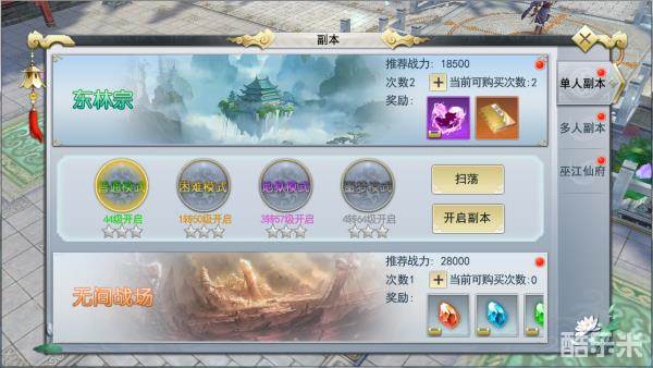 通关成功后,道友们还可额外获得丰富的经验奖励和翻牌中的金钱奖励。一旦获得三星通关的评价还可以开启扫荡功能,一键扫荡快速通关该模式下的秘境。不过,每日只会刷新2次进入东林宗秘境的机会。当使用完2次机会后却仍想再次进入时,就必须自行花费元宝购买次数。另外,尤其需要注意的是该秘境下所有的模式次数是共享的哟。