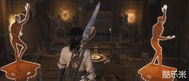 我们想要过去就需要让两个铜像转动的朝向一致,这里靠圆盘是无法做到的,我们需要利用点穴技巧,将一个转动的铜像定身,等另一个转动到一个方向后门就会打开,接下来就会进入第二个场景,同时也是铜像。