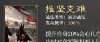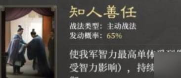 自带主动战法发动率提升6%(受智力影响),每个回合提升自身7%谋略伤害,可叠加,持续到战斗结束。