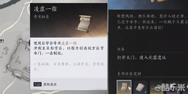 5.玩家在进行偷师武学前还需要学会奇术-凌虚一指,该奇术是需要玩家探索燕北盟获得。