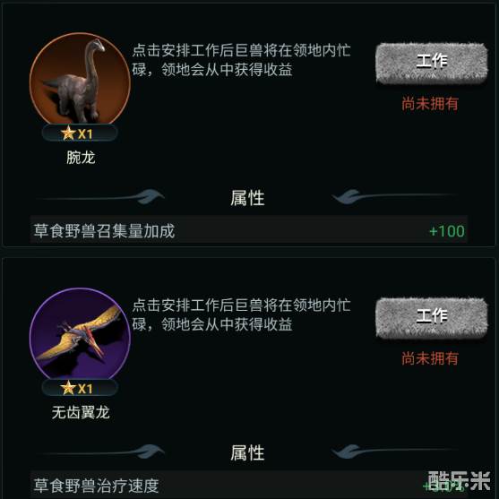 野兽领主新世界游戏中巨兽分为【发展型巨兽】和【战斗型巨兽】,发展型巨兽可以为领地提供各种效果加成,帮助领地高速发展,目前发展型巨兽一共有四种,需要在巨兽栖息地-工作中上阵使用,每一只都有其独特的效果,可以根据当前发展进行选择。下面酷乐米小编给大家带来的《野兽领主:新世界》发展型巨兽加成效果分享,感兴趣的小伙伴们一起来看看吧。