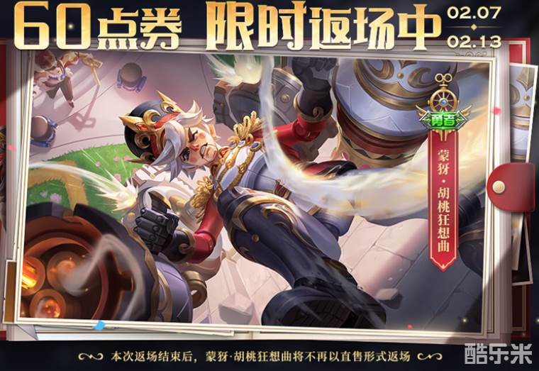 王者荣耀胡桃狂想曲什么时候返场?王者荣耀蒙犽的6元皮肤,胡桃狂想曲即将进行返场,相信很多喜欢玩蒙犽这个游戏角色的玩家都非常期待胡桃的限时返场吧,那么有没有游戏玩家到现在还不知道具体返场的时间,不知道的游戏玩家也没关系,下面和酷乐米小编一起来看看吧