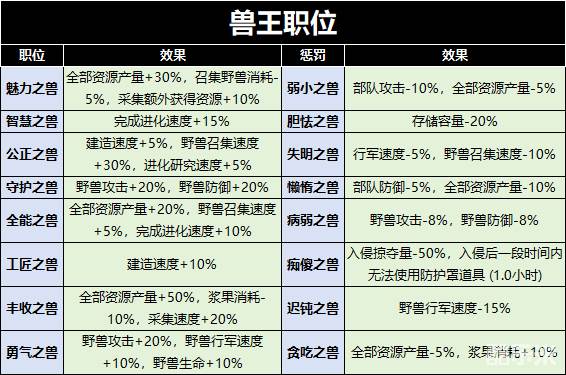 3、兽王一共可以任命16个位职位,8个增益职位和8个减益职位,增益职业可以给兽王战中的盟友,相反减益职位可以给兽王战的强硬阻挠者。