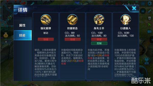 刘备的被动技能可以强化普攻对敌人的伤害,贴脸时伤害最高,并且可以叠加双抗,提高生存能力,一技能属于BUFF技能,可以短暂增加移动速度并强化下一次普攻。二技能是刘备唯一的控制技能,也是突进技能,但是要注意该技能不能穿墙。