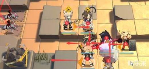 这关很简单,按照下图的顺序和方向依次下干员即可,桃金娘的技能好了就开,以免费用不够。