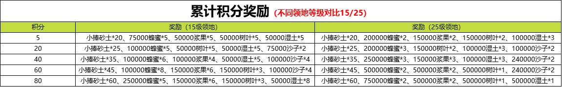 在【干旱土地】或危险湿地的【泥泞沼泽】当中,一共有80个小任务,通过完成各项任务能够获得小捧砂土与及大量资源;累计完成一定数量的积分任务,还能获得额外的阶段(5/20/40/60/80)奖励,下方为对应奖励(仅供参考,实际数据以游戏内实际数据为准)