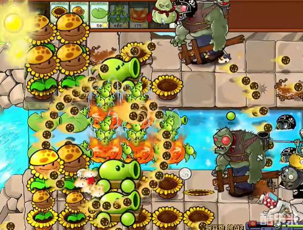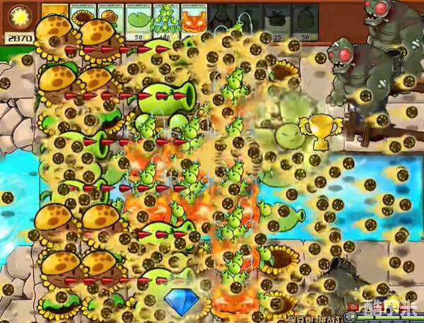 3、阳光向日葵的数量足够之后,我们就去建造一个豌豆喷泉和火南瓜的组合,同时也可以开始放置我们的豌豆大炮。