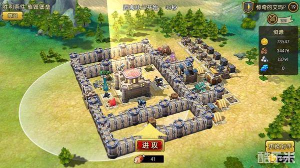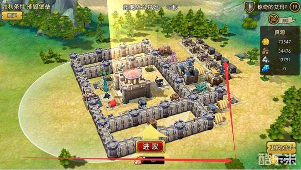 如下图中的城池,周边分布了较多的防御性建筑,如果你的部队配置较强,可以尝试进行正面突破,强攻堡垒,但是即使能够打过,我方的损失也可能较大。而我们也注意到,该城池的“粮草”——资源类建筑周围,却无任何防御性建筑,甚至也不在攻击范围大的雷电塔的覆盖范围。