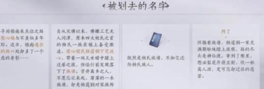 然后失去族谱再返回慈兴镇找到杨道悯,把族谱交给他,这个任务也就完成了,不过直到任务完成,小伙伴们也不知道被划去的名字究竟是谁,算是一个悬念吧,后续或许会有关这个名字的相关剧情。
