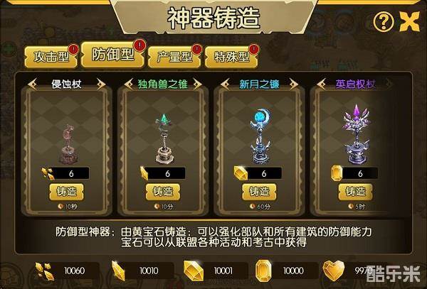 神器分4大类:攻击类,防御类,生产类,特殊类;5个不同的等阶。每类神器有多种属性,每个神器会随机到一个属性,属性效果在一定范围内随机。等阶越高属性越好。