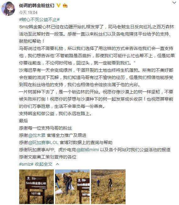 Smlz韩金爱心林已经在边疆开始扎根发芽了,司马老贼生日反向巡礼之百万森林活动至此暂时告一段落。感谢一直以来粉丝们以及各电竞媒体平台给予的支持、鼓励和帮助!