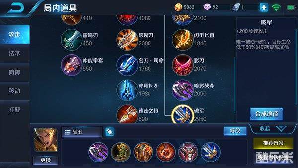 六神装:暗影战斧、影忍之足、红莲斗篷、不死鸟之眼、反伤刺甲、破军