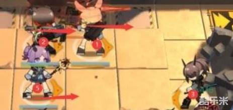 3、如图所示顺序部署高台输出 → 高台输出 → 工具人夜刀 → 群攻近卫 → 单奶。只要高台的输出够给力,剩下的挂机即可。