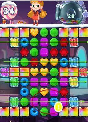 小编心得:首先说明目标泡泡数量为20,图中共有泡泡糖10块,意味着最少消除图中7块泡泡糖并消除其吹出的泡泡便可顺利过关。