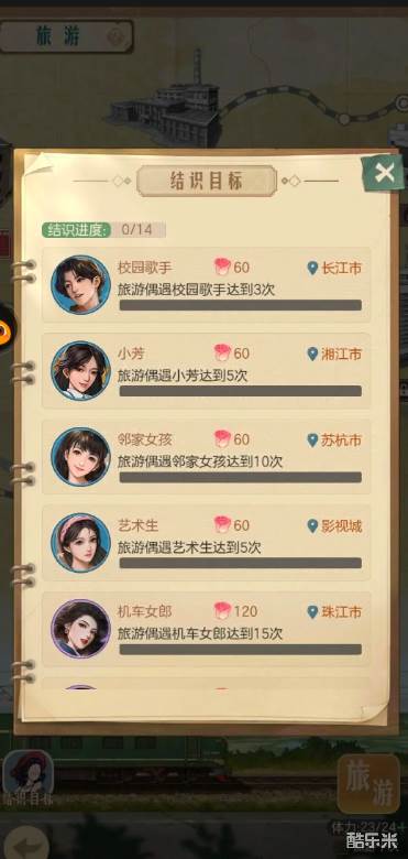 旅游是获取艺人的重要途径,通过触发随机事件可以提升艺人的好感度,好感度达到一定数值,便可以获得该艺人。店长们可以通过旅游界面里的【结识目标】去查看每个艺人的好感度分别要达到多少才能获得。旅游还是阅历获取的核心来源,每次旅游固定获得20点阅历以及其他奖励,包括钻石,艺人魅力值,等等材料,每天总计自动恢复48点体力,即48*20=960点阅历值。此外,除了通过各种活动获取体力值,还能在饭店商店每天将会售卖5个火车票与20张阅历卡,这对于店长们无疑是十分必要的。